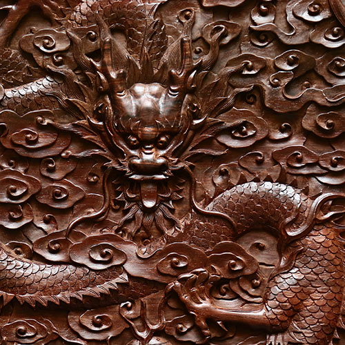 此寶座選用珍貴的大紅酸枝作為原材料,搭腦呈平頭狀,靠背中間高,向兩邊扶手遞減呈梯形。結構設計巧妙,對稱布局,每個面板皆雕著一條騰飛的金龍,刀法精密,圓潤渾厚;龍紋栩栩如生,云紋舒卷生動,龍的姿態(tài)各異,有的昂首前瞻,有的回首瞭望,動感十足。座面嵌裝硬板,束腰內收,雕有纏連枝紋,四條三彎腿做同樣的獸首,足下踩有豐碩的地平,端莊穩(wěn)重。